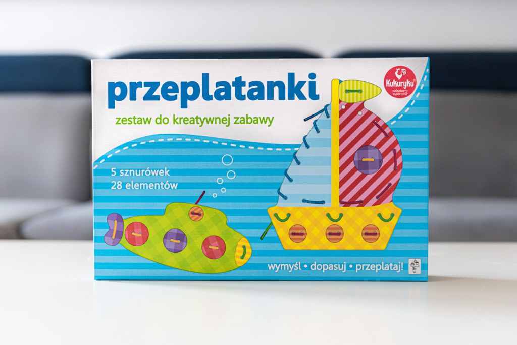 „Przeplatanki” to zestaw do kreatywnej zabawy, który świetnie poprawia koncentracje. Dzieci naprawdę muszą mocno się skupić, aby trafić sznurkiem w odpowiednią dziurkę. Dla nas może wydawać się to proste i banalne, jednak dla 3 latków będzie to duży wyczyn. W zestawie otrzymujemy mnóstwo elementów – statek, autko, balon, łódź podwodna rower i samolot, a także wiele drobniejszych elementów, które z łatwością dopasujemy do większych kształtów. Jednak to może być nieco skomplikowane dla młodszych dzieci – „zszycie” ze sobą dwóch elementów może nie być takie łatwe i wymagać pomocy. Jest do dodatkowy i świetny element, wymagający większej sprawności manualnej. Dodaje atrakcyjności, przez co nasze przeplatanki są jeszcze ciekawsze.